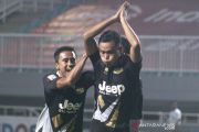 Pesepak bola Martapura Dewa United Selamet Budiono (kanan) melakukan selebrasi setelah mencetak gol ke gawang Persis Solo dalam lanjutan Liga 2 babak semi final di Stadion Pakansari, Kabupaten Bogor, Jawa Barat, Senin (27/12/2021). Persis Solo melaju ke babak final usai memenangi pertandingan dengan skor 2-1. ANTARA FOTO/Yulius Satria Wijaya/aww.