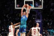 Pebasket Charlotte Hornets Mason Plumlee (tengah) memasukkan bola ke ring lawan dengan dunks yang dijaga pebasket Houston Rockets Christian Wood (kiri) dalam laga lanjutan NBA, di Spectrum Center, Charlotte, North Carolina, Amerika Serikat, Senin (27/12/2021). Charlotte Hornets kalahkan Houston Rockets 123 - 99. ANTARA FOTO/Reuters-Jim Dedmon-USA TODAY Sports/hp.