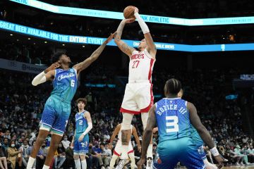 Pebasket Houston Rockets Daniel Theis (tengah) melempar bola melewati pebasket s Charlotte Hornets Jalen McDaniels (kiri) dalam laga lanjutan NBA, di Spectrum Center, Charlotte, North Carolina, Amerika Serikat, Senin (27/12/2021). Charlotte Hornets kalahkan Houston Rockets 123 - 99. ANTARA FOTO/Reuters-Jim Dedmon-USA TODAY Sports/hp.