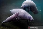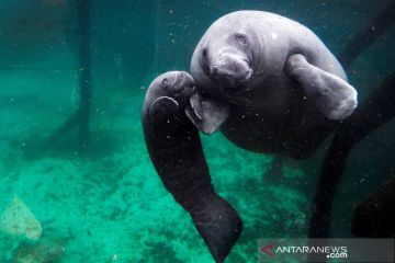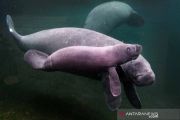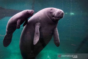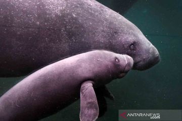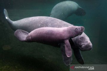 Seekor bayi Lembu Laut atau Manatee (Trichechus manatus) West Indian berenang di dekat induknya usai proses kelahiran di Kebun Binatang Royal Burgers di Arnhem, Belanda, Kamis (30/12/2021). Habitat Manatee berada di daerah Florida, Perairan Karibia dan pesisir laut Amerika Selatan yang hangat dan dangkal. ANTARA FOTO/REUTERS/Piroschka van de Wouw/wsj.