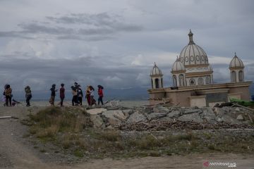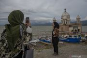 Warga berfoto dengan latar belakang Masjid Terapung yang ambruk ke laut akibat tsunami di Pantai Kampung Lere, Palu, Sulawesi Tengah, Sabtu (1/1/2021). Penutupan sejumlah kawasan wisata selama liburan Natal dan Tahun Baru 2022 oleh pemerintah setempat membuat sebagian warga mengisi liburannya di tempat-tempat terbuka bekas bencana. ANTARA FOTO/Basri Marzuki/hp