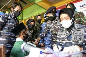 Tertua Korps Wanita TNI AL (Kowal) Wilayah Jakarta Laksamana Pertama TNI Tresna Kusumawati (kedua kanan) bertanya kepada murid sekolah dasar (SD) sebelum mendapatkan vaksin COVID-19 saat serbuan vaksin di Madrasah Ibtidaiyah Al-Wathoniyah di Rorotan, Jakarta, Senin (3/1/2022). Kegiatan vaksinasi tersebut digelar dalam rangka menyambut HUT ke-59 Kowal yang dirayakan setiap 5 Januari sekaligus mendukung program pemerintah terkait pembelajaran tatap muka (PTM). ANTARA FOTO/M Risyal Hidayat/hp.