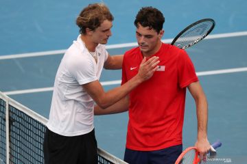 Petenis Jerman Alexander Zverev melakukan selebrasi setelah mengalahkan petenis Amerika Serikat Taylor Fritz dalam babak group Turnamen Tenis Piala ATP, di Sydney Olympic Park, Sydney, Australia, Selasa (4/1/2022). Alexander Zverev berhasil mengalahkan Taylor Fritz straighte set ( 6-4 dan 6-4). ANTARA FOTO/Reuters-Asanka Brendon Ratnayake/hp.