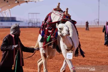 Seorang peserta menyiapkan untanya untuk berparade dalam King Abdulaziz Camel Festival di Riyadh utara, Arab Saudi, Rabu (5/1/2022). Festival ini dimulai pada 1 Desember 2021 dengan partisipasi sekitar 33 ribu pemilik unta. ANTARA FOTO/Xinhua/Wang Haizhou/wsj.