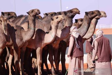 Peserta menyiapkan unta-untanya untuk berparade dalam King Abdulaziz Camel Festival di Riyadh utara, Arab Saudi, Rabu (5/1/2022). Festival ini dimulai pada 1 Desember 2021 dengan partisipasi sekitar 33 ribu pemilik unta. ANTARA FOTO/Xinhua/Wang Haizhou/wsj.