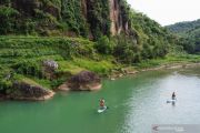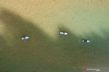 Pengunjung bermain "Stand Up Paddle" di Sungai Oyo, Selopamioro, Imogiri, Bantul, DI Yogyakarta, Jumat (7/1/2022). Aliran Sungai Oyo yang terletak di antara perbukitan dengan bentang alam di sekitarnya menjadi potensi objek wisata alam di Kabupaten Bantul. ANTARA FOTO/Hendra Nurdiyansyah/wsj.