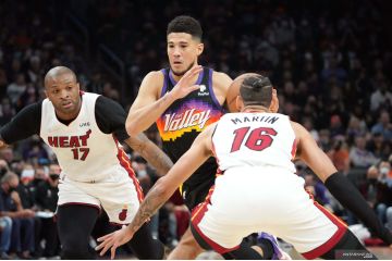 Pebasket Phoenix Suns Devin Booker (tengah) mendribel bola dan dihadang Miami Heat P.J. Tucker (kiri) dan Miami Heat Caleb Martin (kanan) dalam laga lanjutan NBA, di Footprint Center. Phoenix, Arizona, USA, Sabtu (8/1/2022). Miami Heat berhasil mengalahkan Phoenix Suns 123 -100. ANTARA FOTO/Reuters-Joe Camporeale-USA TODAY Sports/hp.