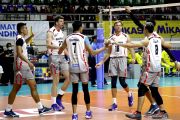 Sejumlah pebola voli Surabaya Bhayangkara Samator melakukan selebrasi setelah mencetak poin saat melawan Kudus Sukun Badak pada laga Proliga 2022 di Padepokan Voli Jenderal Polisi Kunarto, Sentul, Kabupaten Bogor, Jawa Barat, Minggu (9/1/2022). ANTARA FOTO/Yulius Satria Wijaya/foc.