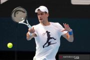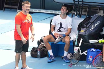 Petenis Serbia Novak Djokovic berlatih jelang Australia Terbuka di Melbourne Park, Melbourne, Australia, Selasa (11/1/2022). Djokovic dinyatakan menang dalam sidang kasus pembatalan visa melawan Pemerintah Australia dan diijinkan tampil pada Australia Terbuka 2022, namun ATP meminta petenis yang telah memenangi sembilan gelar Australia Terbuka itu untuk divaksinasi COVID-19. ANTARA FOTO/Tennis Australia/Scott Barbour/Handout via REUTERS/rwa.