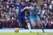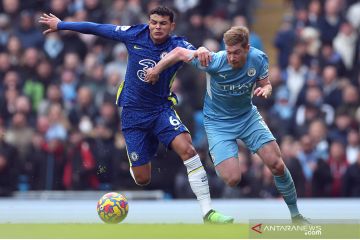 Pesepak bola Manchester City Kevin De Bruyne (kanan) berebut bola dengan pesepak bola Chelsea Thiago Silva dalam laga lanjutan Liga Inggris, di Stadion Etihad, Manchester, Inggris,Sabtu (15/1/2022). Manchester City berhasil mengalahkan Chelsea 1-0 . ANTARA FOTO/Reuters-Carl Recine/hp.