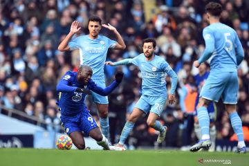 Pesepak bola Chelsea Romelu Lukaku (kiri) berebut bola dengan pesepak bola Manchester City Rodri dan Bernardo Silva dalam laga lanjutan Liga Inggris, di Stadion Etihad, Manchester, Inggris,Sabtu (15/1/2022). Manchester City berhasil mengalahkan Chelsea 1-0 . ANTARA FOTO/Reuters-Peter Powell /hp.