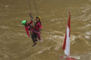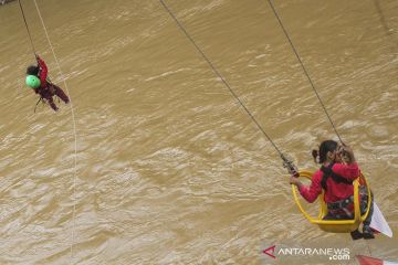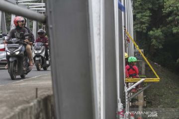 Pengunjung mencoba wahana permainan Bridge Jump di area Komunitas Ciliwung Panus, Depok, Jawa Barat, Minggu (16/1/2022). Wahana uji adrenalin melompat dengan tali dari atas jembatan setinggi 30 meter di atas sungai Ciliwung tersebut dibuka sebulan sekali pada akhir pekan dengan biaya Rp60 ribu per orang dan menjadi wisata alternatif bagi warga setempat. ANTARA FOTO/Asprilla Dwi Adha/aww.