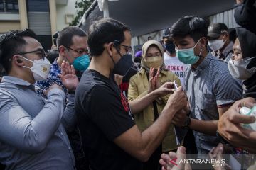 Menteri Pendidikan, Kebudayaan, Riset dan Teknologi Nadiem Makarim (tengah) menerima aspirasi dari mahasiswa Universitas Padjajaran (kanan) yang melakukan aksi harapan untuk pendidikan Indonesia di Universitas Padjajaran, Bandung, Jawa Barat, Senin (17/1/2022). Aksi yang bertepatan dengan kunjungan kerja Mendikbudristek Nadiem Makarim tersebut dilakukan untuk menyampaikan aspirasi masalah pendidikan secara langsung sehingga bisa memperbaiki dan memajukan pendidikan di Indonesia untuk ke depan. ANTARA FOTO/Novrian Arbi/rwa.