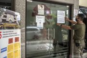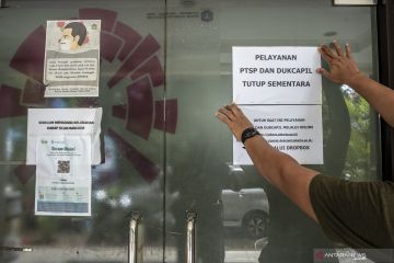 Petugas memasang informasi untuk masyarakat di pintu masuk Kelurahan Gondangdia, Jakarta, Rabu (19/1/2022). Kantor Lurah Gondangdia ditutup karena 33 pegawainya positif COVID-19, namun pelayanan terhadap masyarakat tetap dilakukan dengan mekanisme 'drop box'. ANTARA FOTO/Muhammad Adimaja/wsj.