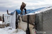 Seorang anak membersihkan salju dari atas tenda pengungsian di sebuah kamp pedesaan Aleppo utara, Suriah, Rabu (19/1/2022). Salju yang mengakibatkan akses jalanan utama terblokir membuat beberapa penduduk serta pengungsi terperangkap badai itu dan kesulitan mendapat bantuan. ANTARA FOTO/REUTERS/Mahmoud Hassano/rwa.