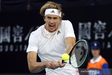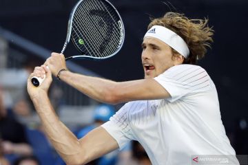 Petenis Jerman Alexander Zverev berupaya mengembalikan bola ke arah lawannya petenis Moldova Radu Albot dalam laga putaran ketiga Turnamen Tenis Australian Open, di Melbourne Park, Melbourne, Australia, Jumat (21/1/2022). Zverev berhasil mengalahkan Radu Albot straight set (6-3, 6-4, dan 6-4). ANTARA FOTO/Reuters-Asanka Brendon Ratnayake/hp.