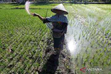 Petani menabur pupuk bersubsidi di area persawahan Indrapuri, Aceh Besar, Aceh, Sabtu (22/1/2022). Untuk menjaga kebutuhan petani, PT Pupuk Indonesia (Persero) saat ini memiliki stok pupuk bersubsidi secara nasional pada awal tahun 2022 sebesar 1,13 juta ton dengan rinciannya pupuk Urea sebesar 512 ribu ton, NPK 305 ribu ton, SP-36 103 ribu ton, ZA 135 ribu Ton dan Organik 80 ribu ton untuk disalurkan pada masa tanam awal 2022. ANTARA FOTO/Irwansyah Putra/wsj.