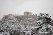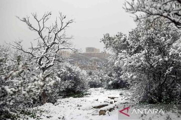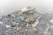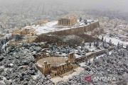 Foto udara memperlihatkan Kuil Parthenon yang berada di puncak bukit Acropolis, saat hujan salju lebat di Athena, Yunani, Senin (24/1/2022). Bangunan megah ini dibangun oleh arsitek terkenal pada abad kelima sebelum Masehi yaitu Callicrates dan Ictius, serta pemahat Phidias. ANTARA FOTO/REUTERS/Alkis Konstantinidis/rwa.