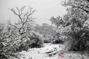 Kuil Parthenon yang berada di puncak bukit Acropolis berselimut salju saat hujan salju lebat di Athena, Yunani, Senin (24/1/2022). Bangunan megah ini dibangun oleh arsitek terkenal pada abad kelima sebelum Masehi yaitu Callicrates dan Ictius, serta pemahat Phidias. ANTARA FOTO/REUTERS/Alkis Konstantinidis/rwa.