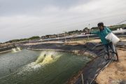 Pekerja memberi pakan udang vaname berumur 50 hari di Binuangeun, Lebak, Banten, Sabtu (29/1/2022). Masyarakat setempat yang membudidayakan udang vaname tersebut mengatakan dalam sekali panen bisa menghasilkan sekitar 25 ton udang vaname dengan omzet keuntungan mencapai miliaran rupiah. ANTARA FOTO/Muhammad Bagus Khoirunas/wsj.