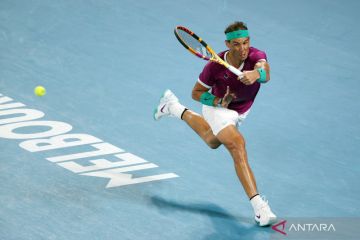Petenis Spanyol Rafael Nadal mengembalikan bola ke arah lawannya petenis Rusia Daniil Medvedev dalam laga final tunggal putra Australia Terbuka di Melbourne Park, Melbourne, Australia, Minggu (30/1/2022). Nadal menang pada partai puncak tersebut dengan skor 2-6, 6-7, 6-4, 6-4, 7-5. ANTARA FOTO/REUTERS/Loren Elliott/foc.