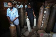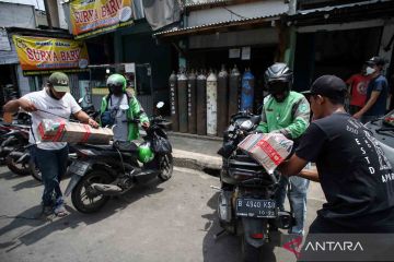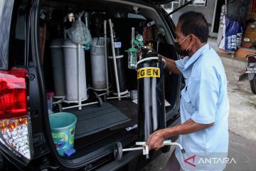 Pekerja menaikkan tabung oksigen ke atas motor di Manggarai, Jakarta, Senin (31/1/2022). Wakil Gubernur DKI Jakarta Ahmad Riza Patria memastikan ketersediaan pasokan oksigen medis di seluruh fasilitas kesehatan Jakarta tercukupi seiring dengan meningkatnya kasus COVID-19 dan keterisian tempat tidur (BOR) di rumah sakit rujukan COVID-19. ANTARA FOTO/Rivan Awal Lingga/wsj.