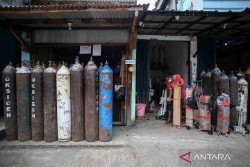 Pekerja mengisi tabung oksigen medis yang sudah dipesan di Manggarai, Jakarta, Senin (31/1/2022). Wakil Gubernur DKI Jakarta Ahmad Riza Patria memastikan ketersediaan pasokan oksigen medis di seluruh fasilitas kesehatan Jakarta tercukupi seiring dengan meningkatnya kasus COVID-19 dan keterisian tempat tidur (BOR) di rumah sakit rujukan COVID-19. ANTARA FOTO/Rivan Awal Lingga/wsj.
