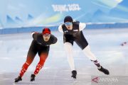 Atlet Ethan Cepuran dari Amerika Serikat dan Atlet Livio Wenger dari Swiss beraksi pada cabor Speed Skating Putra 5000m Olimpiade Musim Dingin Beijing 2022 di National Speed Skating Oval, Beijing, China, Minggu (6/2/2022). ANTARA FOTO/REUTERS/Evgenia Novozhenina/wsj.