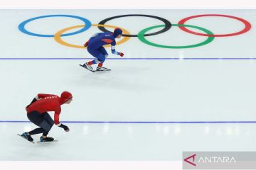 Atlet Ethan Cepuran dari Amerika Serikat beraksi pada cabor Speed Skating Putra 5000m Olimpiade Musim Dingin Beijing 2022 di National Speed Skating Oval, Beijing, China, Minggu (6/2/2022). ANTARA FOTO/REUTERS/Evgenia Novozhenina/wsj.