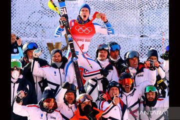 Atlet Ski Prancis Clement Noel (tengah atas) berselebrasi dengan medali emasnya usai menjuarai nomor Alpine Skiing Men's Slalom Olimpiade Musim Dingin Beijing 2022 di National Alpine Skiing Centre, Distrik Yanqing, China, Rabu (16/2/2022). ANTARA FOTO/REUTERS/Jorge Silva/wsj.