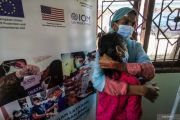 Pengungsi etnis Rohingya memeluk anaknya usai menjalani vaksinasi COVID-19 dosis kedua di tempat penampungan sementara BLK Desa Meunasah Mee Kandang, Muara Dua, Lhokseumawe, Aceh, Jumat (18/2/2022). Sebanyak 67 orang dari total 108 pengungsi Rohingya yang ditampung sejak 31 Desember 2021 itu dilaporkan telah melarikan diri dari BLK. ANTARA FOTO/Rahmad/foc.