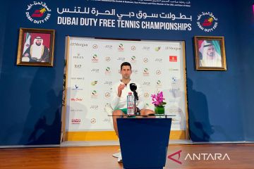 Petenis Serbia Novak Djokovic memberikan keterangan pers jelang pertandingan Dubai Tennis Championships di Dubai Duty Free Tennis Stadium, Dubai, Uni Emirat Arab, Minggu (20/2/2022). ANTARA FOTO/REUTERS/Alexander Cornwell/aww.