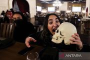 Seorang wanita mengambil foto sambil berpose dengan tengkorak boneka di restoran Shadows yang bertema horor, di Riyadh, Arab Saudi, dalam gambar yang diambil pada Kamis (17/2/2022). ANTARA FOTO/REUTERS/Ahmed Yosri/aww.