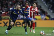 Pesepak bola Atletico Madrid Joao Felix (kanan) berebut bola dengan pesepak bola Manchester United Luke Shaw (kiri) dalam laga leg pertama babak 16 besar Liga Champions, di Stadion Wanda Metropolitano, Madrid, Spanyol, Rabu (23/2/2022). Atletico Madrid menahan imbang Manchester United dengan skor 1-1. ANTARA FOTO/Reuters--Javier Barbancho/hp.