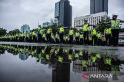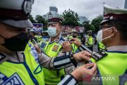Personel Polisi Lalu Lintas mengikuti Apel Gelar Pasukan Operasi Kepolisian Mandiri Kewilayahan Ops Keselamatan Jaya 2022 di Lapangan Presisi Ditlantas Polda Metro Jaya, Jakarta, Selasa (1/3/2022). Sebanyak 3.164 personel gabungan TNI-Polri dan Pemprov DKI Jakarta akan dikerahkan dalam Ops Keselamatan Jaya 2022. ANTARA FOTO/Aprillio Akbar/aww.
