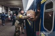 Para tentara memindahkan pasokan barang di sebuah stasiun kereta di Kiev, Ukraina, Kamis (3/3/2022). ANTARA FOTO/Xinhua/Diego Herrera/rwa.