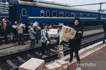 Para sukarelawan memindahkan pasokan barang di sebuah stasiun kereta di Kiev, Ukraina, Kamis (3/3/2022). ANTARA FOTO/Xinhua/Diego Herrera/rwa.