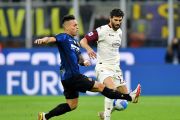 Pesepak Inter Milan Lautaro Martinez (kiri) berebut bola dengan pesepak bola Salernitana Federico Fazio dalam laga lanjutan Liga Italia, di Stadion San Siro, Milan, Italia, Jumat (4/3/2022). Inter mengalahkan Salernitana 5-0 dan Lautaro hat-trick membuat hat-trick dalam pertandingan ini. ANTARA FOTO/Reuters--Daniele Mascolo/hp.