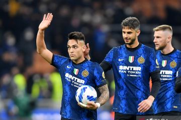 Pesepak bola Inter Milan Lautaro Martinez (kiri) melakukan selebrasi bersama rekannya setelah pertandingan usai melawan Salernitana dalam laga lanjutan Liga Italia, di Stadion San Siro, Milan, Italia, Jumat (4/3/2022). Inter mengalahkan Salernitana 5-0 dan Lautaro hat-trick membuat hat0trick dalam pertandingan ini. ANTARA FOTO/Reuters--Daniele Mascolo/hp.