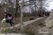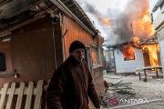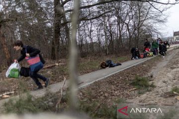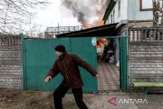 Seorang penduduk setempat bereaksi ketika sebuah rumah terbakar setelah penembakan dengan senjata berat di satu-satunya rute pelarian yang digunakan oleh penduduk setempat untuk meninggalkan kota Irpin, sementara pasukan Rusia bergerak maju menuju ibu kota, 24 km dari Kyiv, Ukraina (6/3/2022). ANTARA FOTO/REUTERS/Carlos Barria/aww.