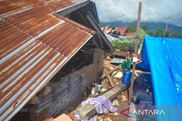 Seorang anak berada di depan rumahnya yang rusak akibat gempa di Nagari Malampah, Kecamatan Tigo Nagari, Kabupaten Pasaman, Sumatera Barat, Senin (7/3/2022). Data terakhir BNPB, sebanyak 1.736 rumah terverifikasi tingkat kerusakan akibat gempa magnitudo (M) 6,1 di Kabupaten Pasaman, dengan rincian 651 rumah rusak berat, 355 rusak sedang dan 730 rusak ringan. ANTARA FOTO/Iggoy el Fitra/aww.