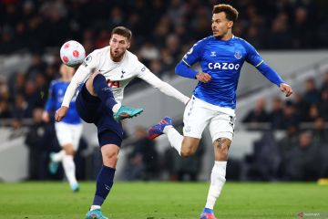 Pesepak bola Tottenham Hotspur Matt Doherty (kanan) berebut bola degan pesepak bola Everton Dele Alli (kiri) dalam laga lanjutan Liga Inggris, di Stadion Tottenham Hotspur, London, Inggris, Senin (7/3/2022). Tottenham Hotspur bantai Everton lima gol tanpa balas dan Harry Kane mencetak dua gol dalam pertandingan ini. ANTARA FOTO/Reuters-David Klein/hp.