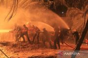 Sejumlah petugas pemadam kebakaran berusaha memadamkan api di sumur minyak ilegal yang berada di kawasan pemukiman penduduk Desa Mata Ie, Kecamatan Ranto Peureulak, Aceh Timur, Sabtu (12/3/2022). Kebakaran di salah satu sumur minyak ilegal pada Jumat (11/3/2022) sekitar pukul 23.30 WIB tersebut mengakibatkan tiga warga mengalami luka bakar serius. ANTARA FOTO/Syifa Yulinnas/rwa.