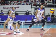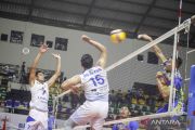 Pebola voli Bogor Lavani Gonzales Garcia (kiri) terjatuh saat menahan serangan dari pebola voli Surabaya Bhayangkara Samator pada babak Final Four Proliga 2022 di Padepokan Voli Jenderal Polisi Kunarto, Sentul, Kabupaten Bogor, Jawa Barat, Sabtu (12/3/2022). Surabaya Bhayangkara Samator menang dengan skor 3-2 (21-25, 22-25, 27-25, 25-21, 15-12). ANTARA FOTO/Yulius Satria Wijaya/wsj.