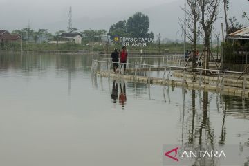 Pelajar melintasi pedestrian Kolam Retensi Andir yang terendam banjir di Baleendah, Kabupaten Bandung, Jawa Barat, Selasa (15/3/2022). Berdasarkan evaluasi Dinas Lingkungan Hidup Jawa Barat dan PPK DAS Citarum, momentum tahun keempat Perpres 15/2018 Program Citarum Harum saat ini telah mengubah kondisi Sungai Citarum mencapai level cemar ringan dengan target pada 2025 mendatang diharapkan mencapai mutu air kelas II dengan Indeks Kualitas Air (IKA) 60 poin. ANTARA FOTO/Novrian Arbi/rwa.
