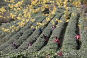 Penduduk desa bekerja di sebuah perkebunan teh yang berada di wilayah Danzhai. Provinsi Guizhou, China barat daya, Selasa (15/3/2022). ANTARA FOTO/Xinhua/Huang Xiaohai/rwa.