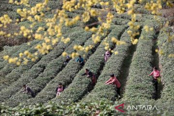 Foto udara saat penduduk desa bekerja memetik daunteh di perkebunan wilayah Zigui, Provinsi Hubei, China tengah, Selasa (15/3/2022). ANTARA FOTO/Xinhua/Zheng Jiayu/rwa.