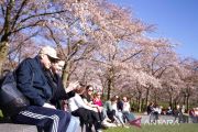 Orang-orang suasana di bawah pohon bunga sakura yang bermekaran di Amstelveen, Belanda, Jumat (18/3/2022). ANTARA FOTO/Xinhua/Sylvia Lederer/rwa.