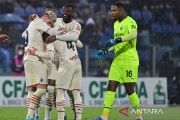 Pemain AC Milan merayakan gol ke gawang Cagliari pada pertandingan Liga Italia Serie A di Sardegna Arena, Cagliari, Minggu (20/3/2022) dini hari. Milan memenangi pertandingan melalui gol tunggal Ismael Bennacer dan untuk sementara berada di puncak klasemen. ANTARA FOTO/REUTERS/Alberto Lingria/pras.