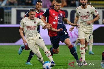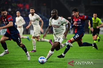 Pemain AC Milan Franck Kessie menggiring bola melewati pemain Cagliari pada pertandingan Liga Italia Serie A di Sardegna Arena, Cagliari, Minggu (20/3/2022) dini hari. Milan memenangi pertandingan melalui gol tunggal Ismael Bennacer dan untuk sementara berada di puncak klasemen. ANTARA FOTO/REUTERS/Alberto Lingria/pras.